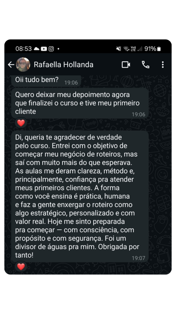 Eu sei disso porque foram os meus roteiros personalizados que chamaram atenção de personalidades do mercado, que chegavam até mim buscando uma experiência personalizada e inesquecível.